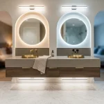 For compact spaces where square footage limits traditional solutions, corner vanities with diagonal mirror installations maximize unused wall space while creating an unexpectedly elegant focal point. A wraparound counter at 45 degrees allows two users to work simultaneously without direct confrontation, and the angled geometry makes even tight bathrooms feel more intentional and designed rather than cramped.
