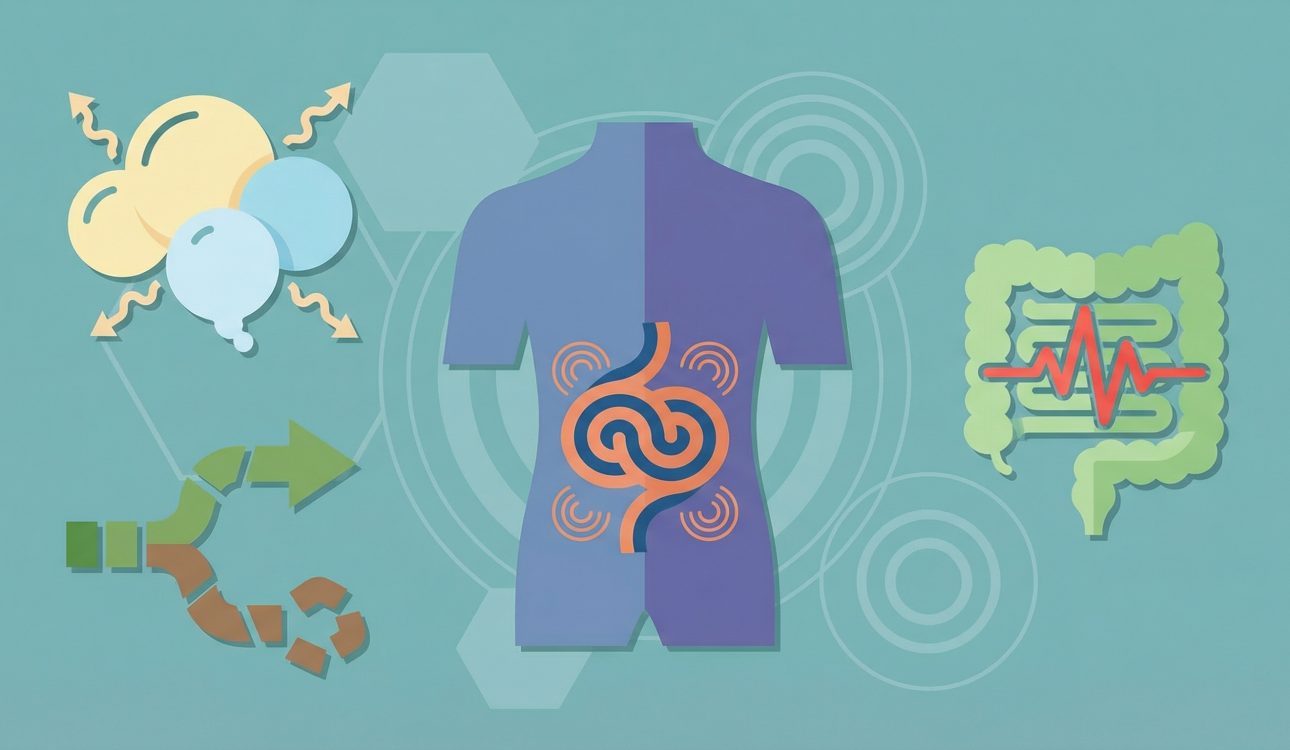 Избыточное газообразование связано с особенностями работы микробиоты кишечника. При СРК баланс микроорганизмов может быть нарушен, что приводит к усиленному брожению углеводов и образованию водорода, метана и углекислого газа. Это усугубляется, если человек потребляет много газообразующих продуктов: бобовые, капуста, сырые овощи, газированные напитки.