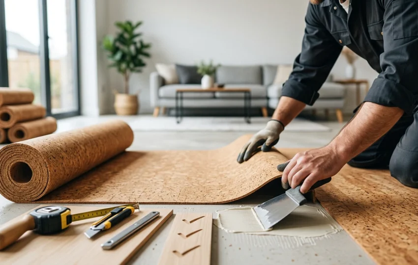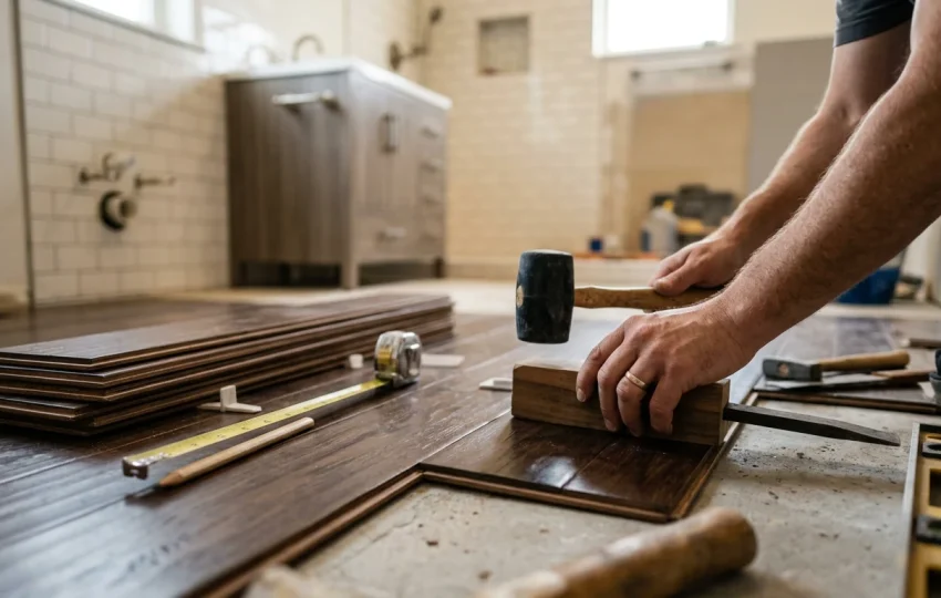 Professional flooring installation with precise measurements, proper subfloor preparation, and seamless finishing.